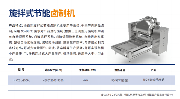 全?動(dòng)旋拌式節(jié)能?制機(jī)主要?于禽類、??等?制品?制,采? 95-98 °C ??對產(chǎn)品進(jìn)??制(根據(jù)?藝調(diào)整),?制機(jī)中設(shè)有?動(dòng)恒溫系統(tǒng)、?液循環(huán)系統(tǒng)、?液調(diào)配熬制系統(tǒng)、?動(dòng)進(jìn)出料系統(tǒng);整機(jī)?動(dòng)化程度?,減輕勞動(dòng)強(qiáng)度,提??產(chǎn)效率,與傳統(tǒng)?制流?線對?,可減少?量蒸汽、?液、??料等?產(chǎn)損耗,并可實(shí)現(xiàn)單機(jī)?產(chǎn)量使 ?、多機(jī)連續(xù)式?產(chǎn)量?產(chǎn),機(jī)動(dòng)性強(qiáng),適?于?中?型企業(yè)。