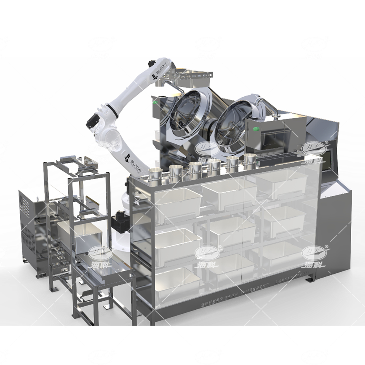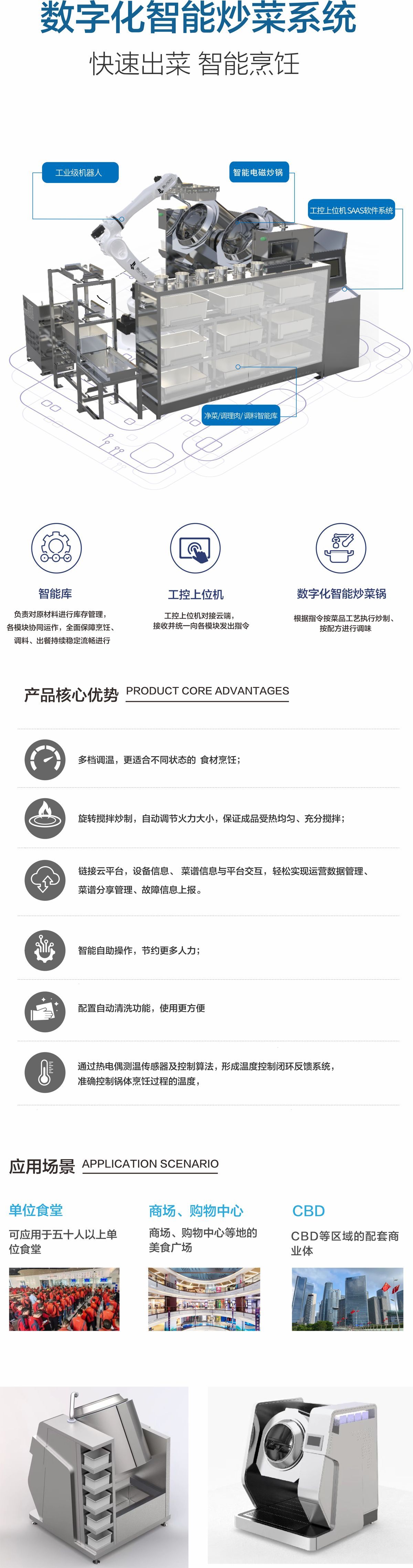 可用于集體用餐的食堂(機(jī)關(guān)、院校、工廠、中央廚房配餐中心等大型食堂)等場景量身打造的烹飪系統(tǒng),主要由空盆/成品智能庫、凈菜/調(diào)理肉/調(diào)料智能庫、工控上位機(jī)SaaS軟件系統(tǒng)、數(shù)字化智能炒菜鍋以及工業(yè)級機(jī)器人組成,工控上位機(jī)對接云端,接收并統(tǒng)一向各模塊發(fā)出指令。